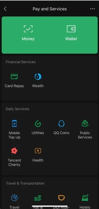To pay, either scan a merchant's QR code (via Discover > Scan) or have them scan yours (find it under Me > Pay & Services > Money)