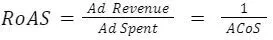RoAS stands for Return on Ads Spent and is very similar to ACoS. It is defined as followed: